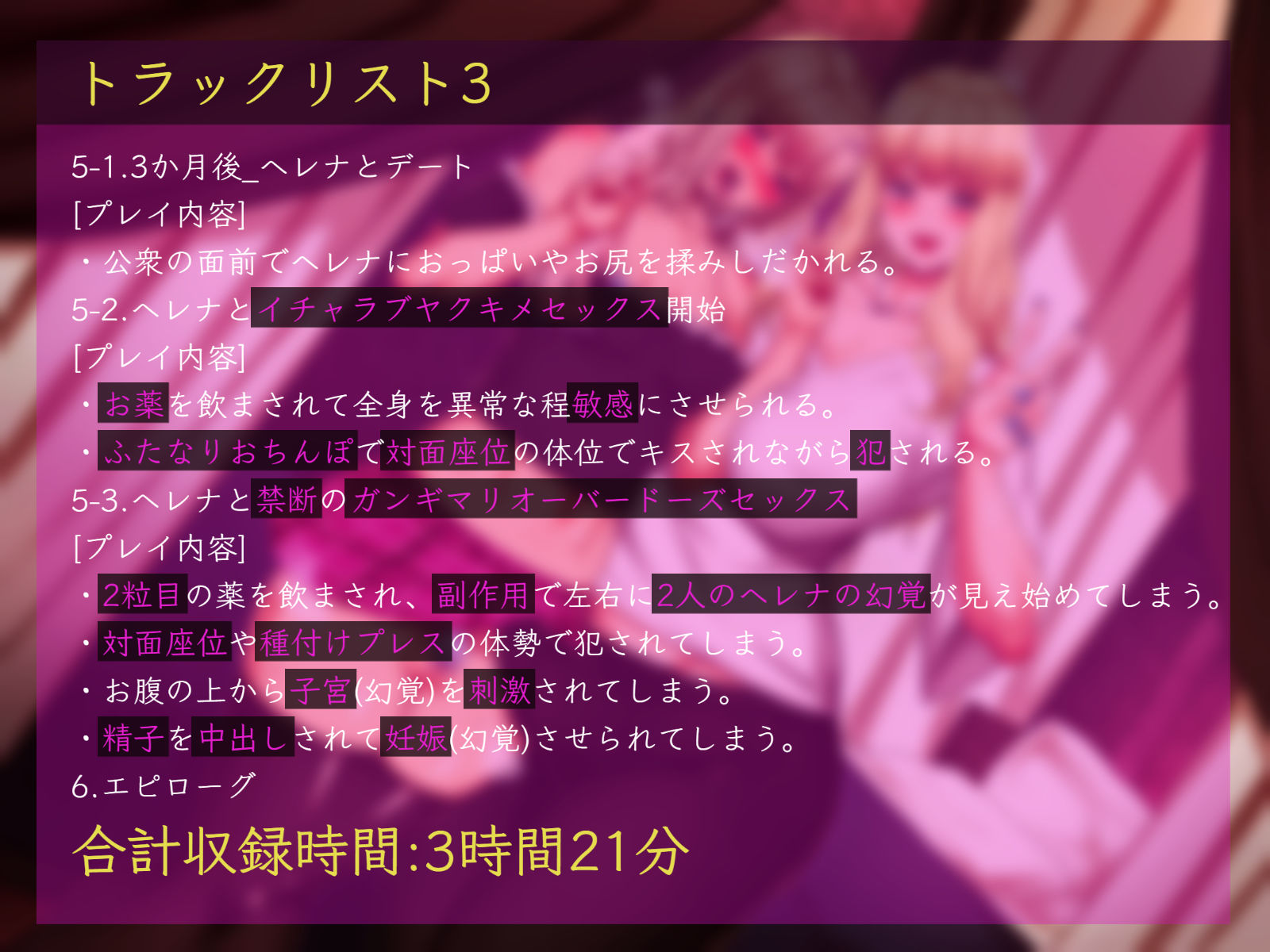 ・2粒目の薬を飲まされて、副作用でヘレナが3人に見え始め、左右の2人のヘレナからキスをされたり、息を吹きかけられたり、言葉責めをされ続けてしまう。