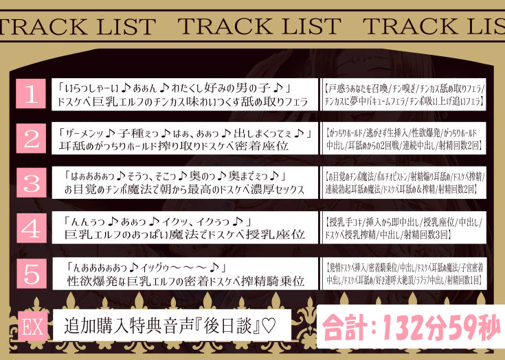 約 84分 … トラック1〜5と追加購入特典『ドスケベ巨乳エルフ役演じる海音ミズチ様のフリートーク』『ドスケベエルフのHな激エロ目覚ましボイス』込み