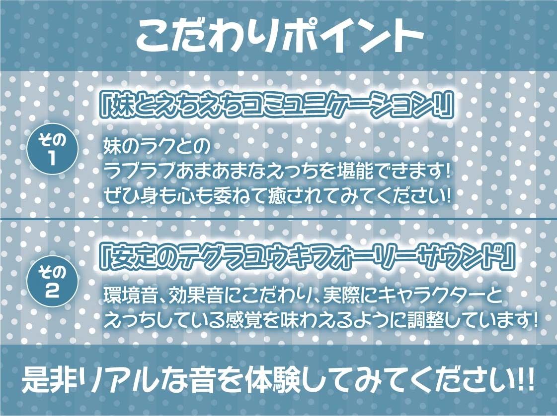 ジャンル: 中出し、フェラ、アナル、ラブラブ・あまあま、癒し、実妹、男性向け、成人向け、手コキ、足コキ