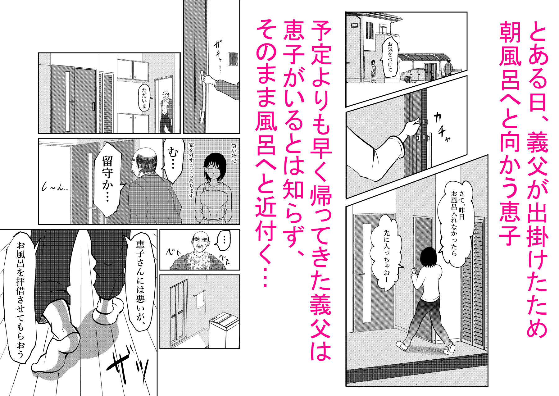 義父は予定よりも早く帰宅し、何も知らぬまま、恵子のいる風呂場へと近づいていく…。