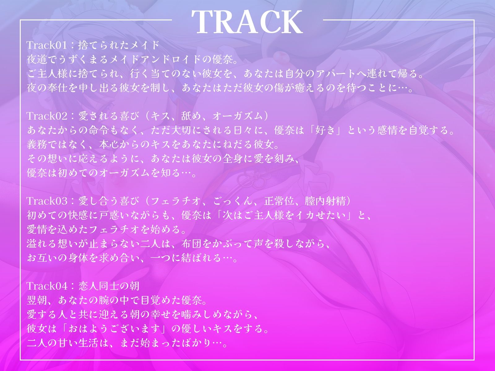 ジャンル: ファンタジー、メイド、巨乳、中出し、フェラ、ラブラブ・あまあま、ロボット、男性向け、成人向け、ASMR、オホ声、KU100