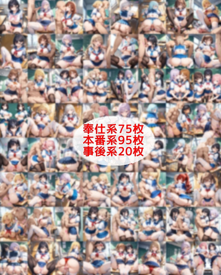 パンチラ系40枚、セクハラ系50枚、ぶっかけ系70枚、奉仕系75枚、本番H95枚、事後系20枚の350枚に加えて「JKに嫌な顔されながらパンツ見せてもらってオナニー射精するイラスト集」に登場する30名のヒロインに1人イラスト4枚ずつで合計120枚。