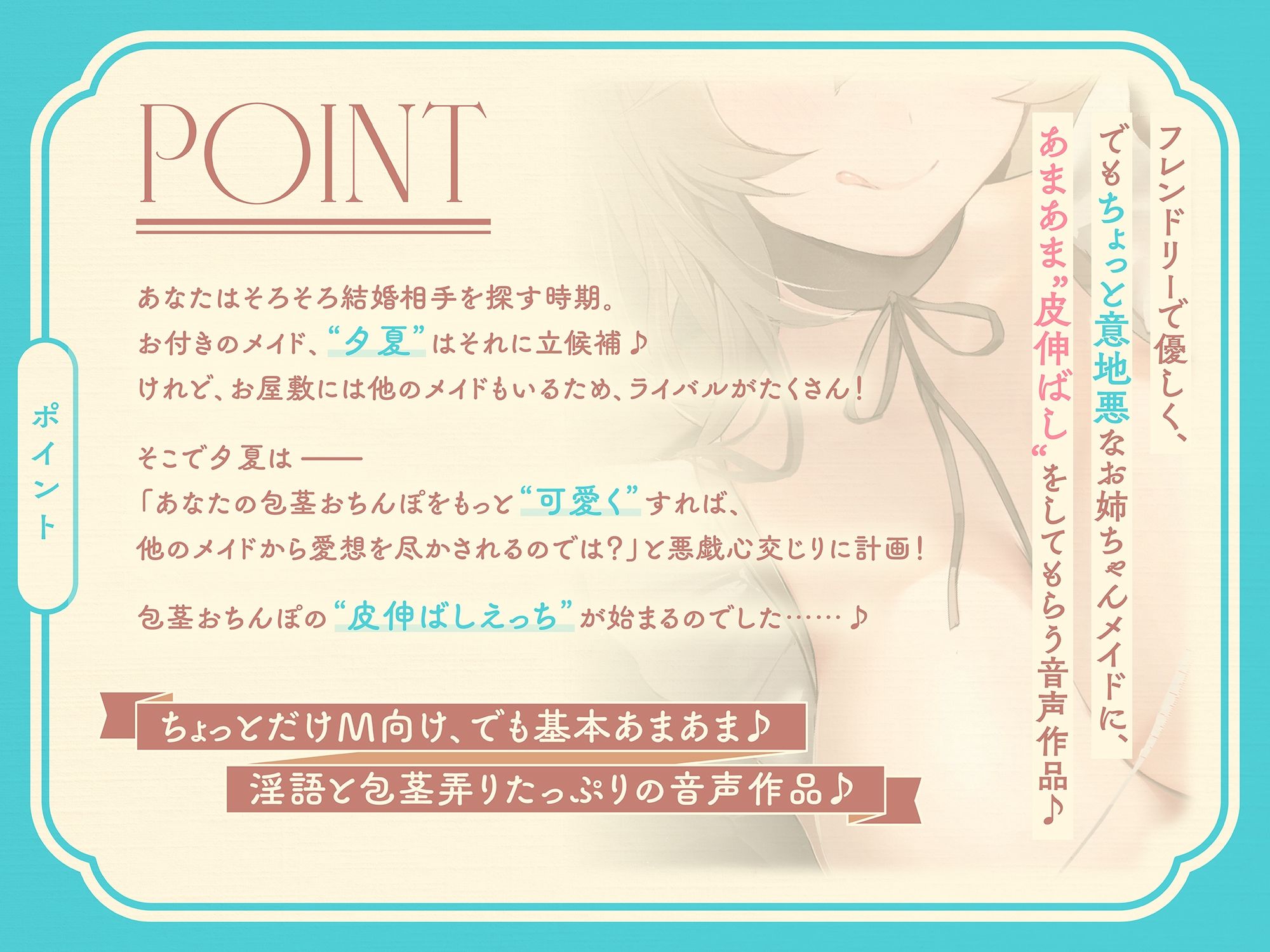 ・フレンドリーで優しく、でもちょっと意地悪なお姉ちゃんメイドに、あまあま‘皮伸ばし’をしてもらう音声作品♪