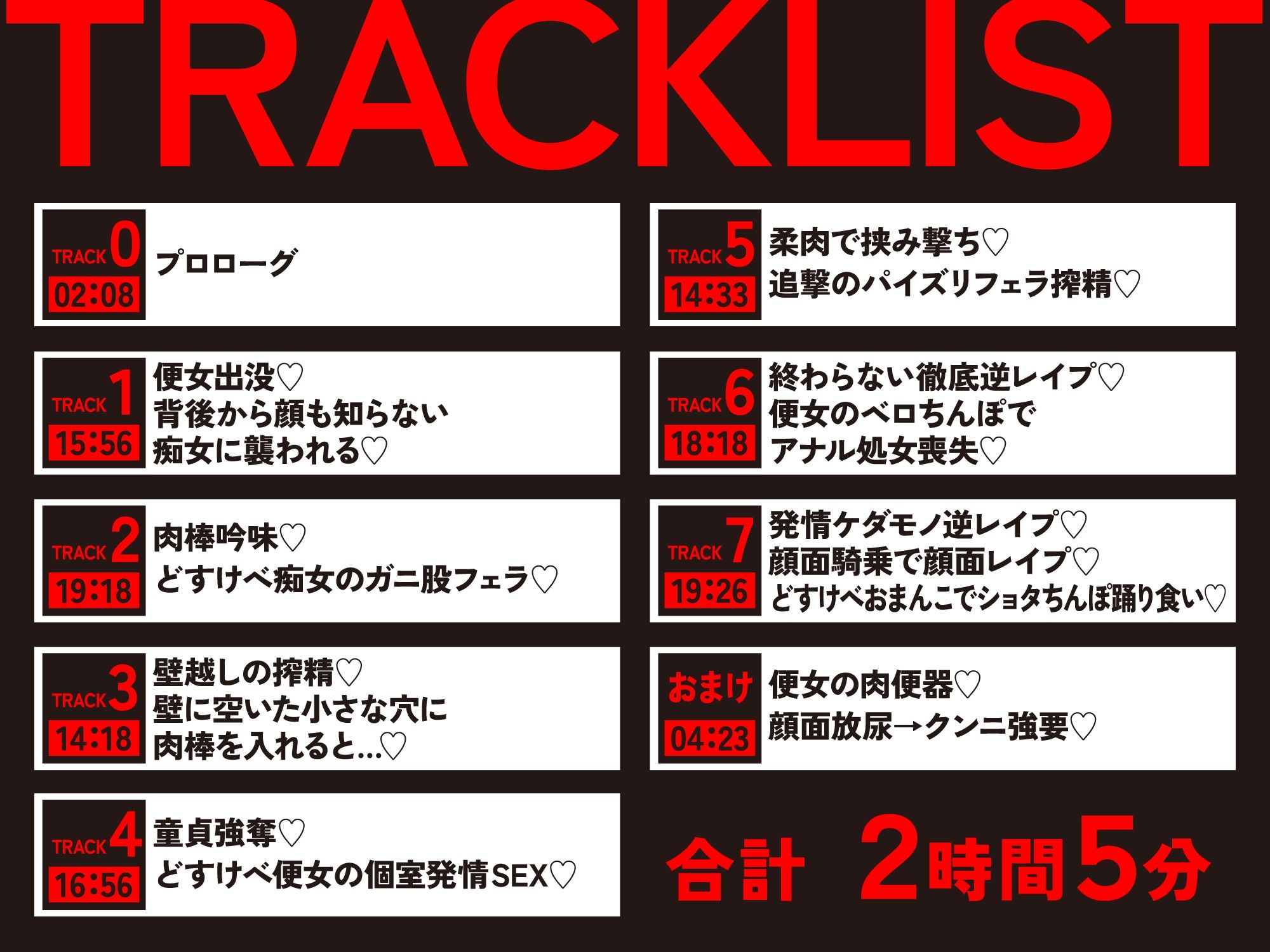 受験生のあなたは深夜まで塾に通い、自宅への最短ルートである公園を突っ切っていた。途中尿意を催した貴方は公演の男子便所に立ち寄る。すると、後ろの個室から近づくハイヒールの音。次の瞬間、放尿中の貴方の口を手で塞がれ、背後から股間を握られる。「ダメよ坊や…大声出しちゃあ」「大人しくしていれば悪いようにはしないから…(はーと)」息の荒い女の声。そして股間を掴んでいた手が動き出す。貴方は迷い込んでしまったのだ。どすけべ女の狩場に…(はーと)